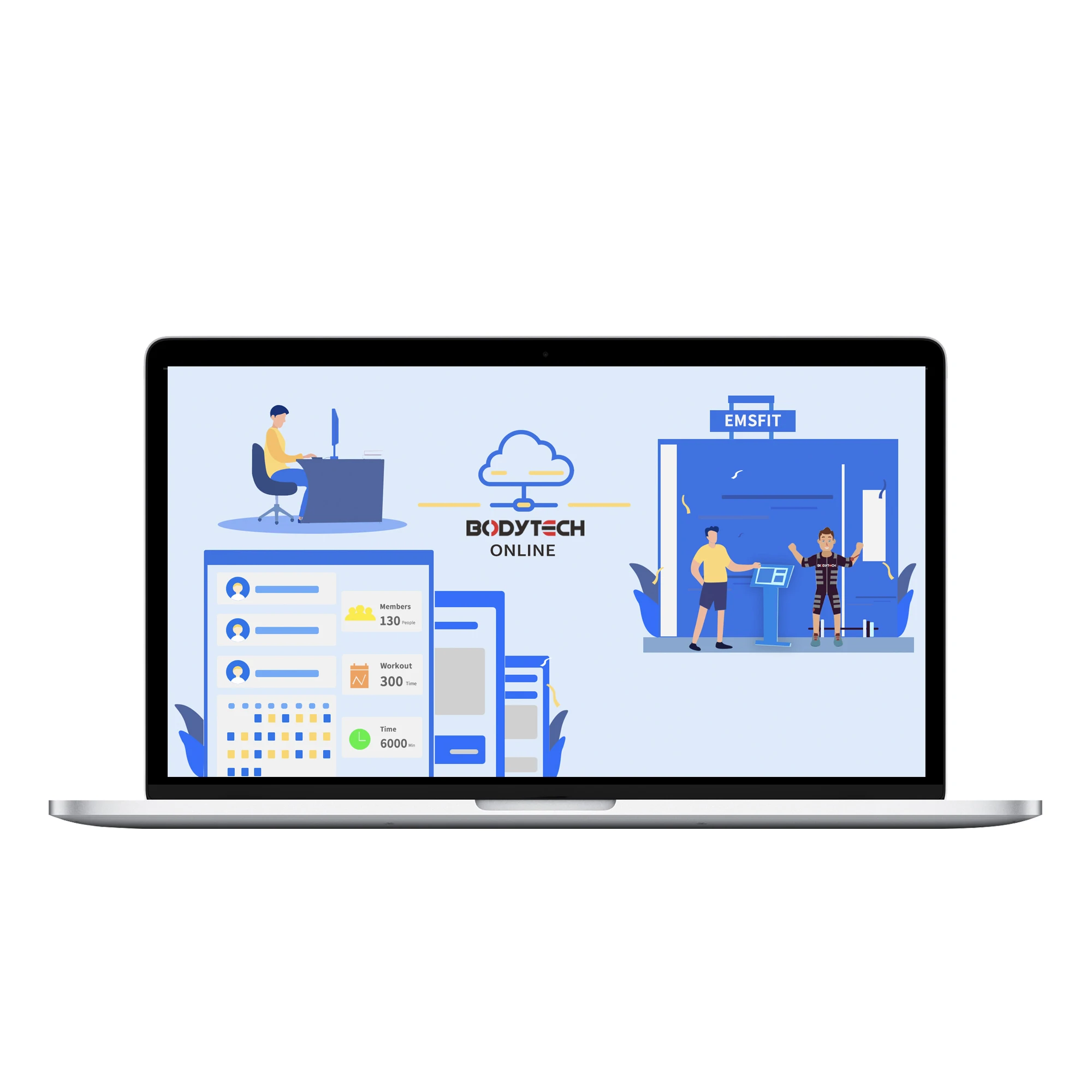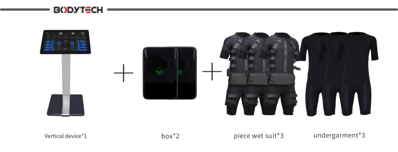 1* Stand equipment with controller (Gym management system) 3* EMS Wet jacket 3* Inner cotton suit 2* Wireless devices box (with battery) + charger 1* Instruction manual