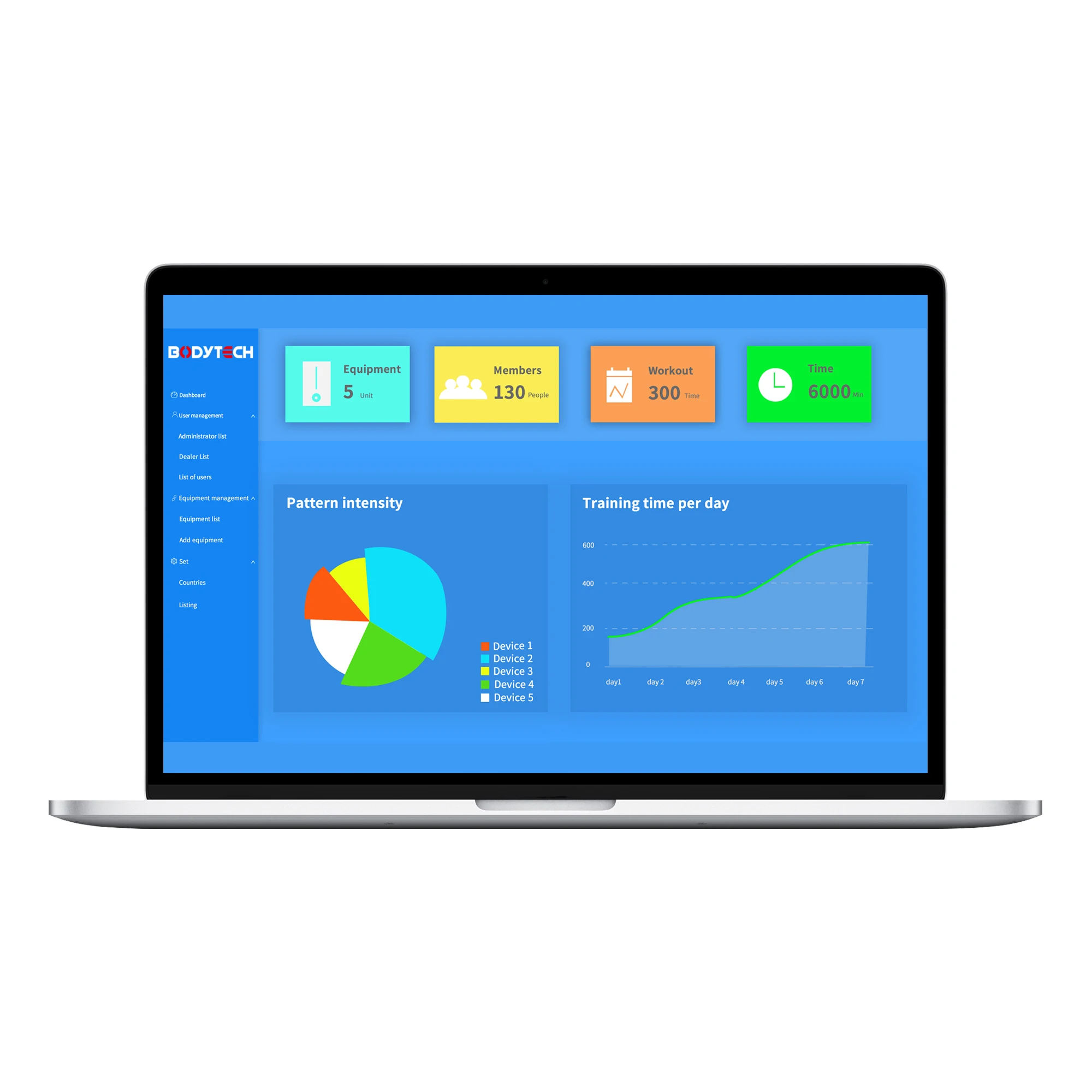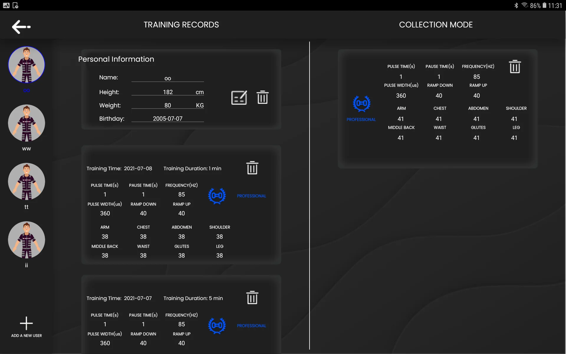 App with 6 training patterns: fat burn, strength,cardio, relax, professional, vip