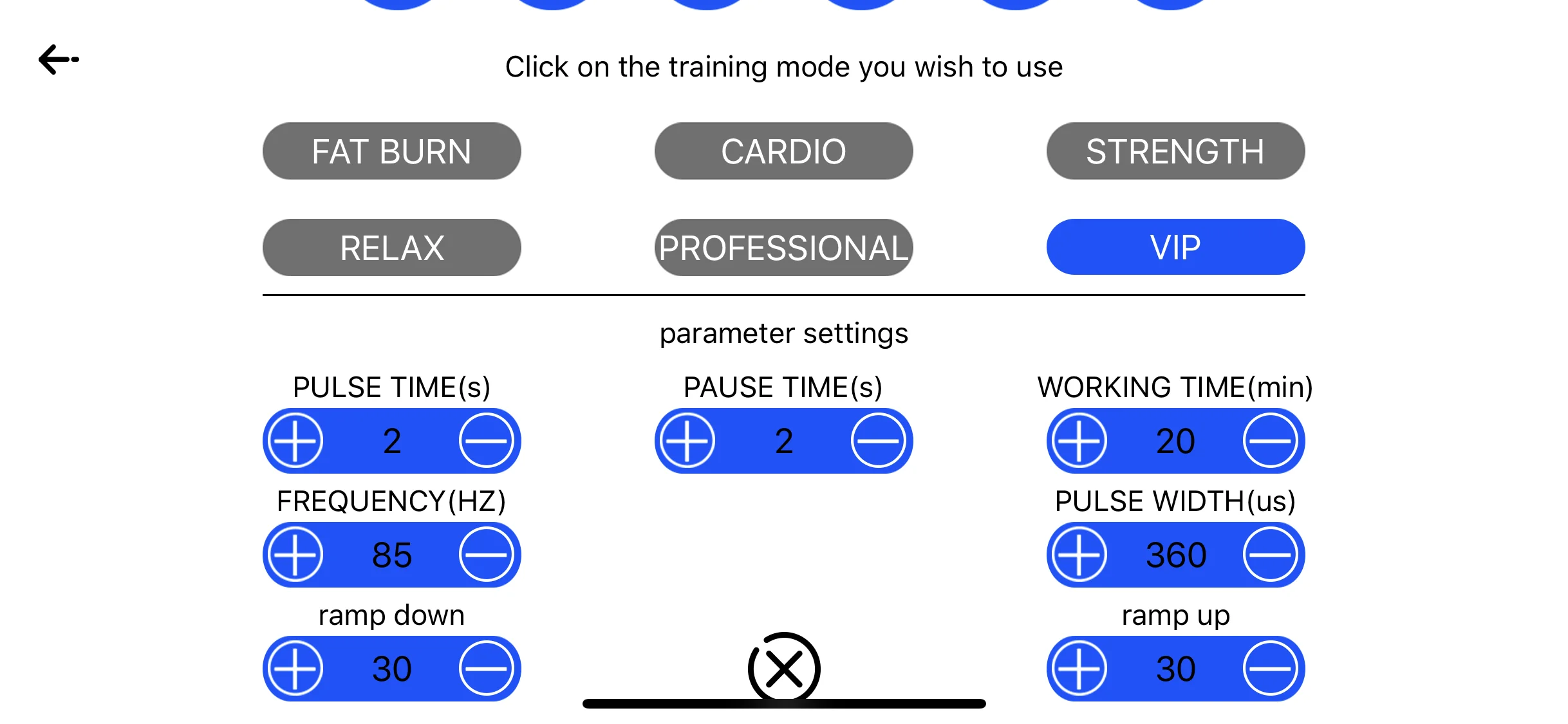 Training parameters in VIP pattern can be modified, including frequency, pulse width, ramp up, etc. These parameters can be modified as professionals deem necessary.