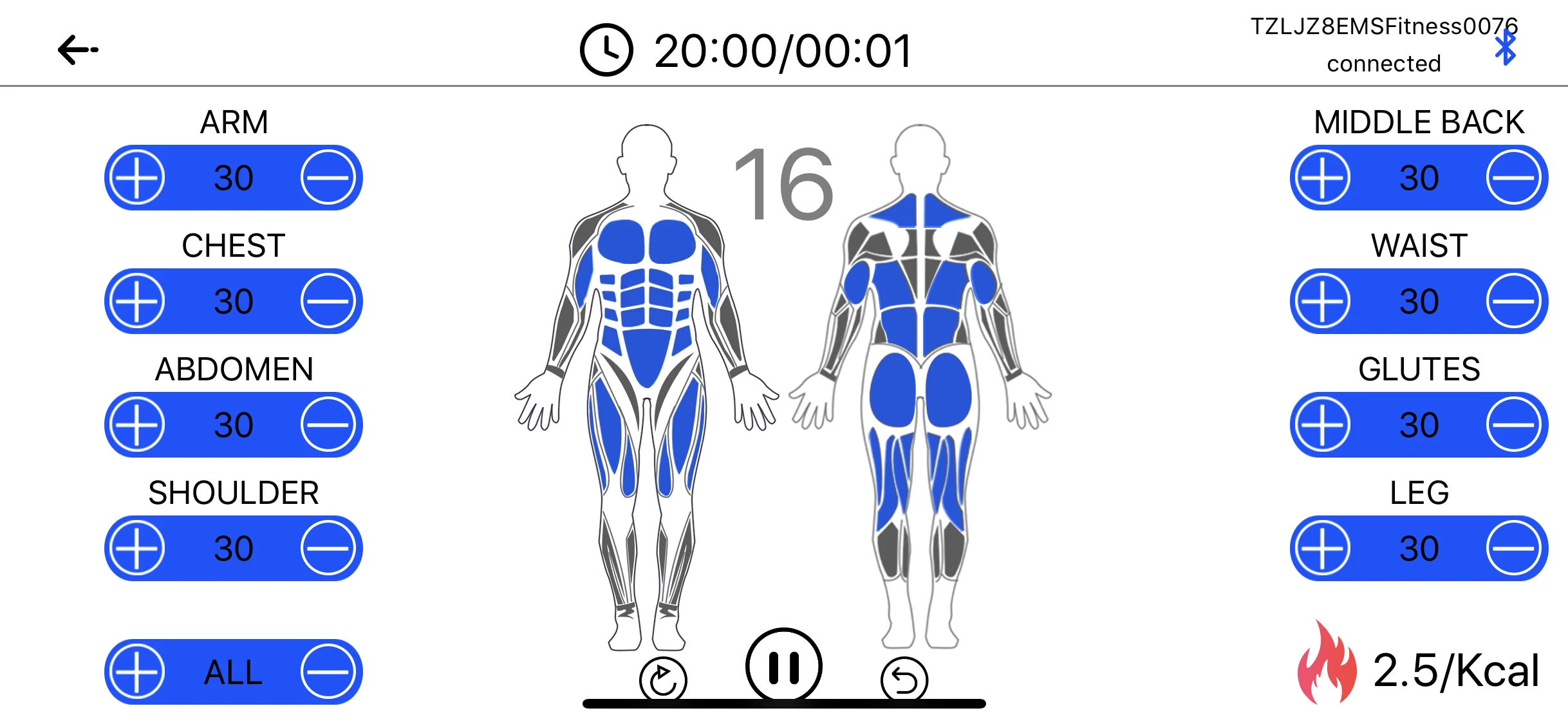 8 individual channels control pulse stimulation of 20 muscle groups, almost all muscles can be trained.