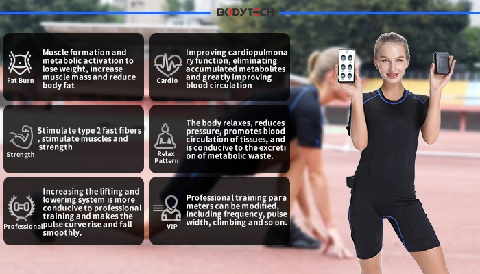 1.Our APP have six modes: Fat burn, strength, cardio, Professional, Relax, and VIP. And the interface of APP is very simple and clean. It's easy to use.Or if you want more mode, all parameter can adjustable in VIP model.The vest has arm-bound and leg-bound pole piece, you can adjust it by yourself.