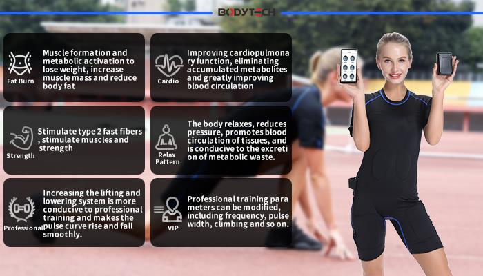 Made from super compression fabric (85% polyamide and 15% spandex), BODYTECH ensures the user has maximum flexibility of movement. The suit implant silver electrode to deliver a pulse to the human body with low impedance.